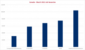 While COVID caused increases in demand for certain products and services in sectors that already had difficulties finding qualified workers, the Federal Government launched a plan that gives Canadians enhanced unemployment benefits, at a time when Canadians and Permanent Residents are already reluctant to work in certain jobs. Mr. Bernard stated that “those factors together could mean that someone who might have been jumping at a job in a warehouse is now more reticent.”