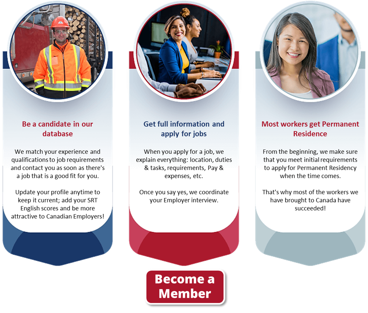 Members get job opportunities for a brighter future. Create your Worker Profile, add your Resume to our database, get SRT to assess and improve your English, and apply to Jobs. Members also get FREE access to SRT, to test and improve their English, and be more attractive to Canadian Employers! You’ll need English to work in Canada, so start preparing yourself now. Act now and click on the image above to become a Member!