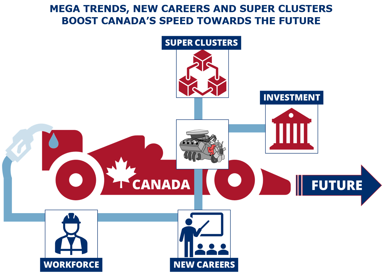 Canada wants to have several of the faster racecars in the race, and for each of them to win their race or at least get into the top-3 places. Focused Investment, targeted Super Clusters, a responsive Education System that offers tailored Emerging Career paths, and a Workforce with the right skill set and enough workers, all need to fuel Canada’s economic engine to win this race. This is shown in the graphic below.